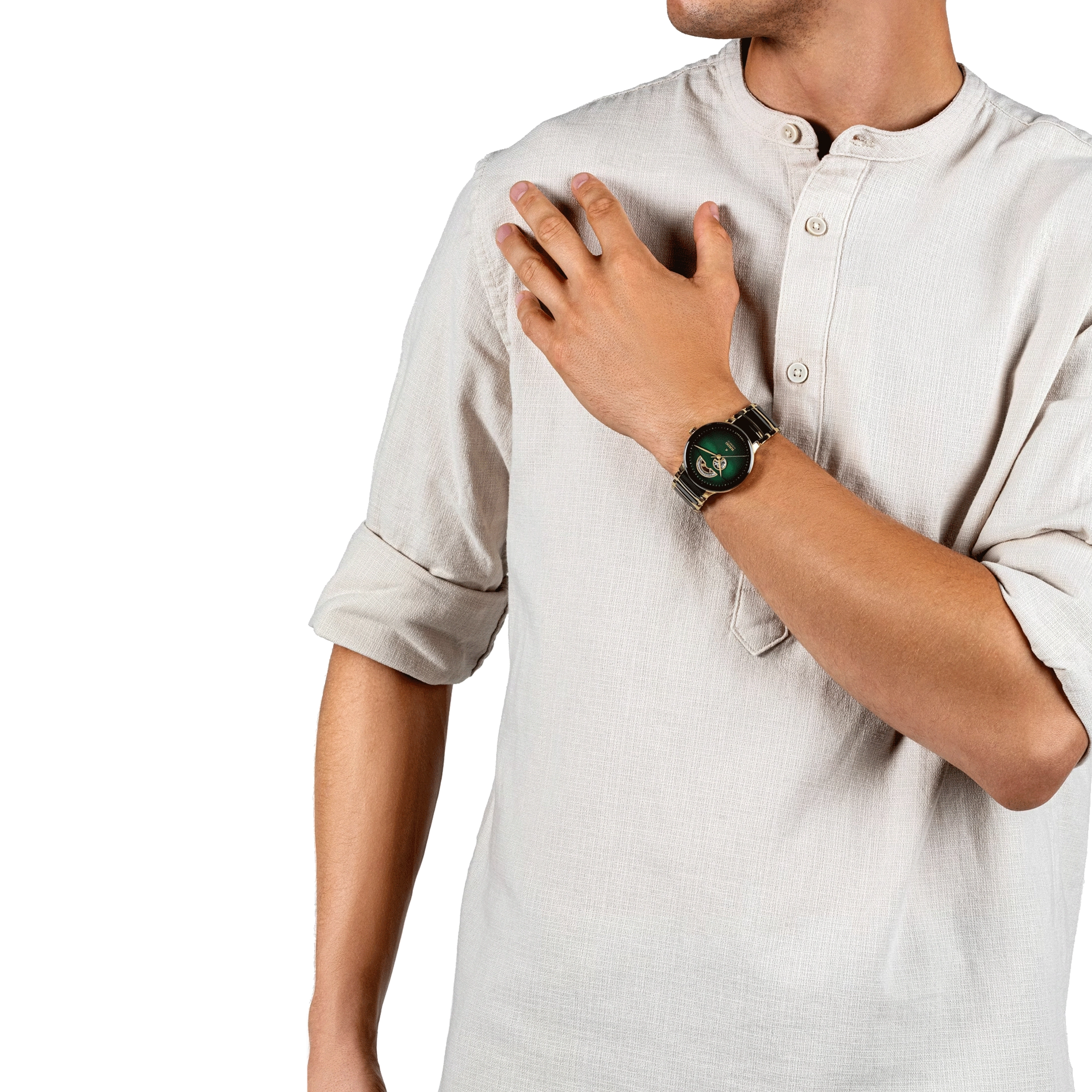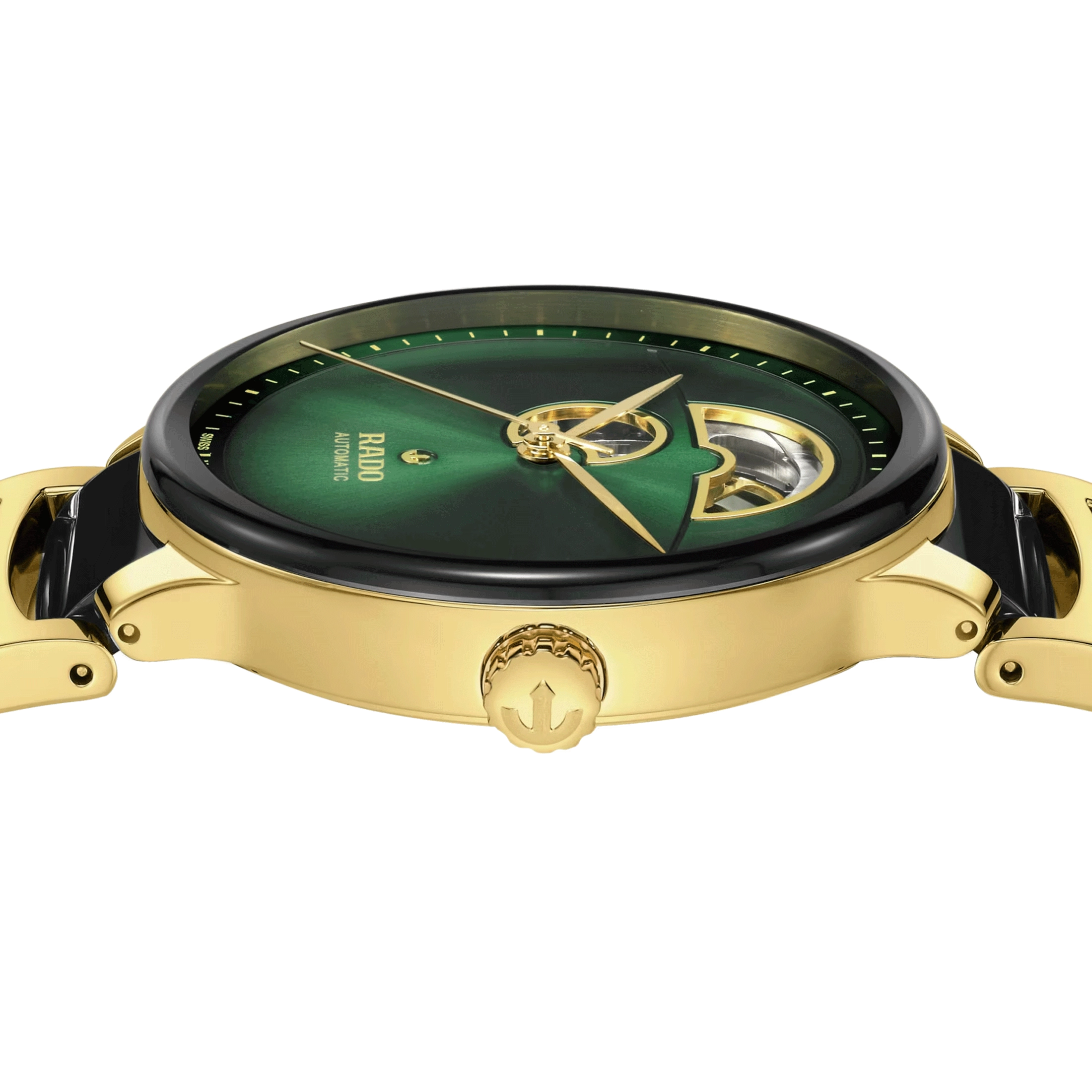 Rado Centrix Open Heart automatic watch green dial steel bracelet PVD yellow gold and black ceramic 39.5 mm