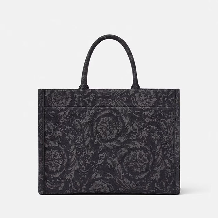 This tote bag is crafted from jacquard Barocco canvas and features rigid top handles and a detachable